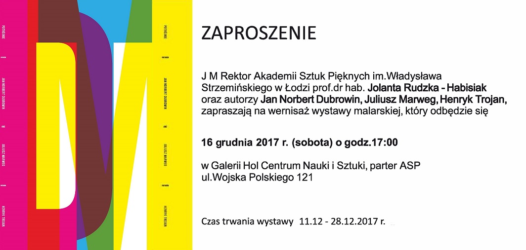 Henryk Trojan zaprasza na wernisaż wystawy malarskiej, na ktorej prezentowane będzie jego malarstwo obok obrazów dwóch innych zananych artystów. Organizatorem jest JM Rektor Akademii Sztuk Pięknych w Łodzi.