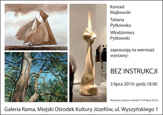 Serdecznie zapraszamy na wernisaż wystawy Tatiany Pytkowskiej, Konrada Majkowskiego, i Włodka Pytkowskiego pt. "Bez instrukcji"